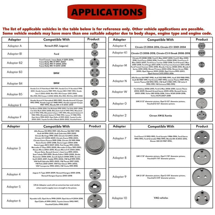 24-PIECE PNEUMATIC BRAKE CALIPER COMPRESSION TOOL SET: This set comprises 1 pneumatic tool and 23 adapters, compatible with numerous American, European, and Japanese vehicle makes and models.